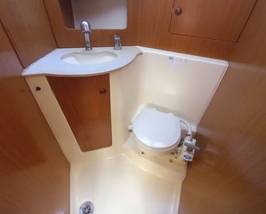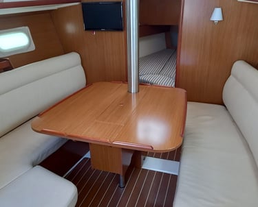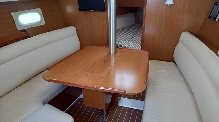 Durante el fondeo o atraque, te impresionará la generosa cabina del Sun Odyssey 32i. En su interior, disfrutarás de detalles refinados en cada compartimento, con maderas nobles de colores claros que crean un ambiente acogedor y sofisticado. Este alquiler de barco en Altea te permitirá disfrutar de dos amplios camarotes, tanto en proa como en popa, y un salón con una mesa central de gran dimensión y alas abatibles, perfecto para compartir comidas y momentos inolvidables.